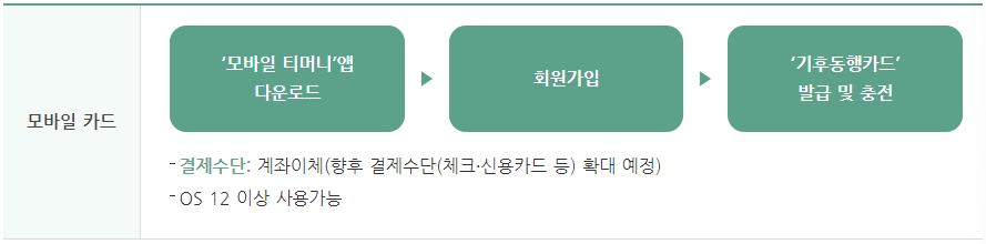 기후 동행카드는 모바일 카드와 실물카드 두 가지 모두 사용 가능합니다. 모바일은 '모바일 티머니'앱에서 발급받을 수 있으며, 안드로이드에서만 가능해 ios기반 휴대전화 가용자는 실물카드를 이용해야 합니다. 실물카드는 지하철 고객안전실과 역사 인근 편의점에서 구매 가능합니다. 실물카드의 경우 3,000원의 별도 구매 비용이 필요하니 참고하시기 바랍니다.