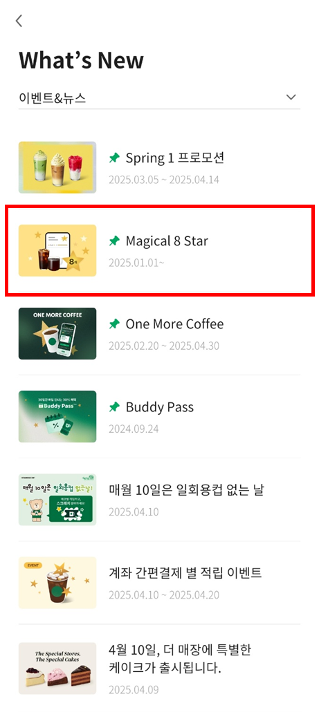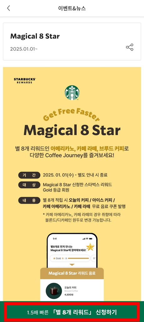 스타벅스 Magical 8 Star란, 기존 12개의 별을 모아야 받을 수 있던 음료 쿠폰을 8개로 변경해 받을 수 있는 이벤트입니다.